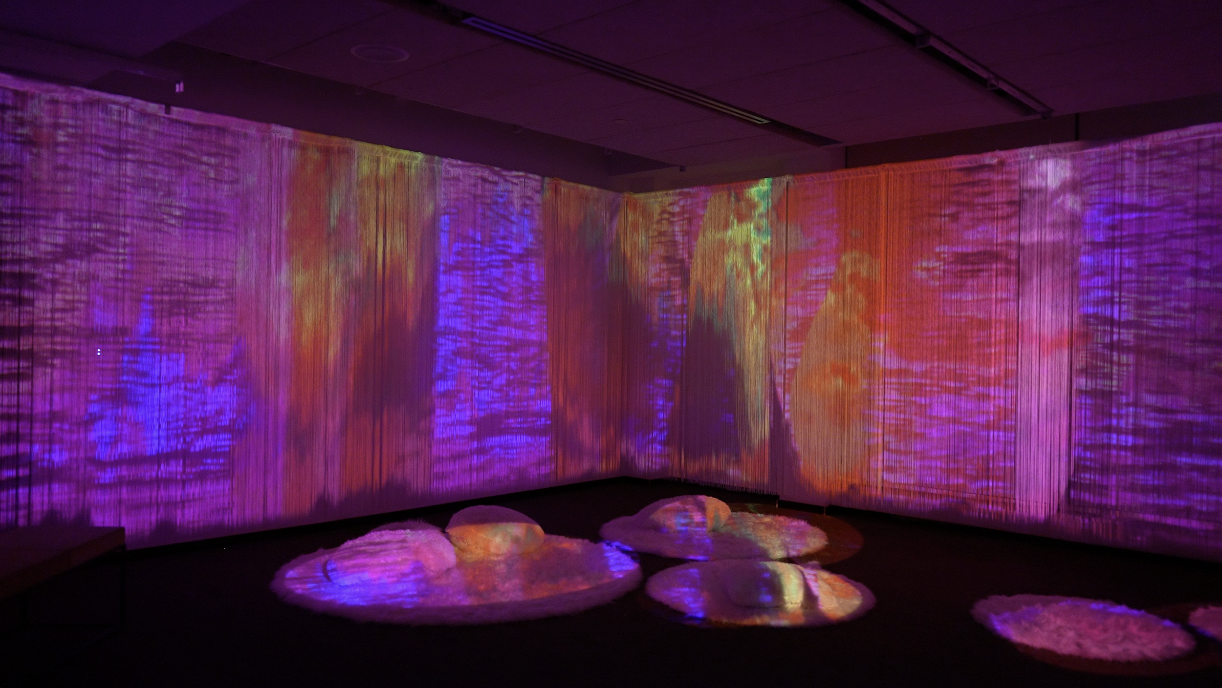 This installation naturally invites participation — Viewers are invited to touch, interact, and take photos with the string. There will also be faux fur rugs and floor pillows for lounging and comfortably observing the artwork in a relaxing, inspirational space.
